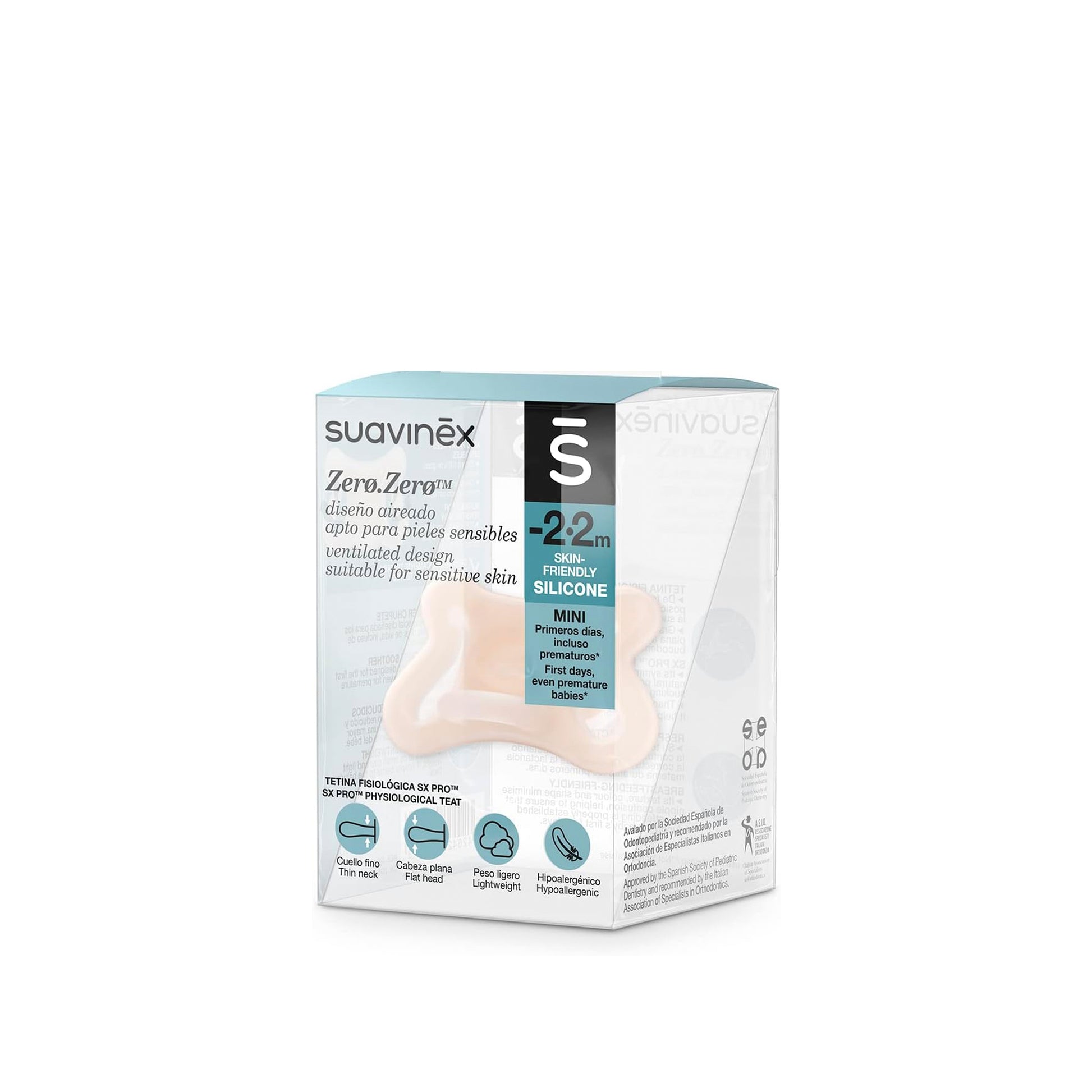 Diseñado para funcionar en conjunto con la botella anticólica Zerø.Zerø, con una forma, sensación y sombra compartidos entre la botella y el pepe. Avalado por la SEOP (Sociedad Española de Odontología Pediátrica).